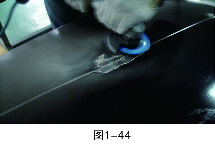 步驟3(除漆):打磨漆層,至板件金屬裸露后進(jìn)行清潔,然后再進(jìn)行鈑金作業(yè),如圖1-44所示。