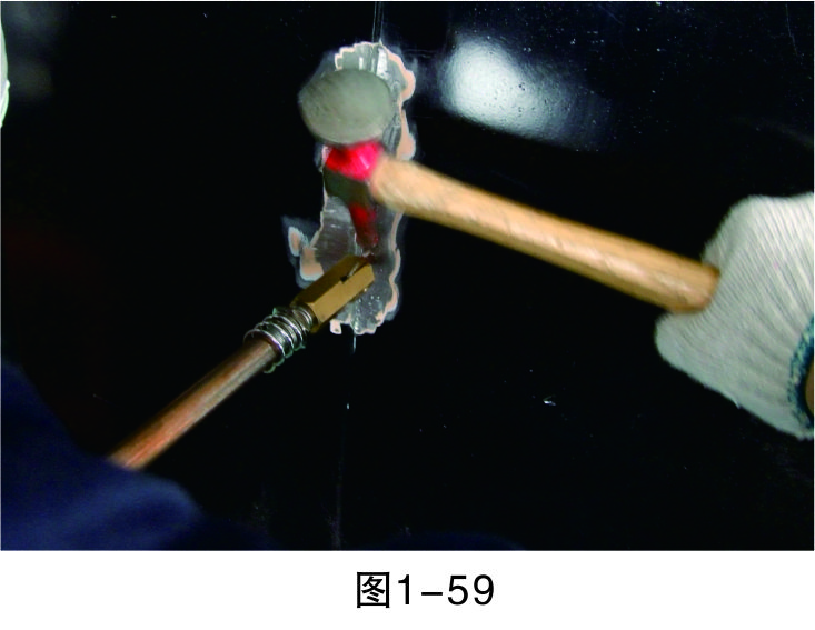 步驟18(拉低打高):對(duì)相對(duì)低的位置進(jìn)行拉伸,對(duì)相對(duì)高的位置進(jìn)行敲擊,要注意焊拉槍與鈑金錘的配合,重點(diǎn)是把握好力度,如圖1-59所示。