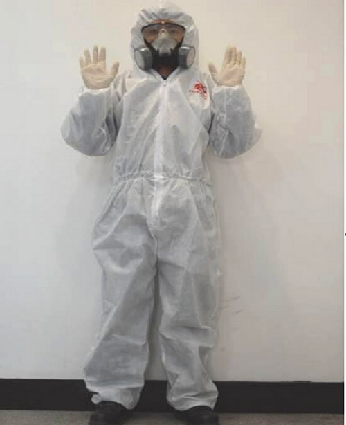 刮涂原子灰過程中,由于有毒溶劑的揮發(fā),為保護(hù)施工人員的人身安全,施工人員必須穿噴漆服、護(hù)目眼鏡、防毒面罩、無硅乳膠手套、防溶劑手套、工作鞋等。如圖2-30所示
