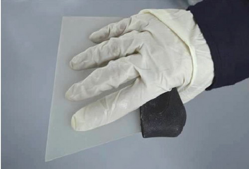 (7)如此重復(fù)地拌和,在這過程中注意觀察混合物顏色的均勻程度,直到原子灰充分拌和。如圖2-39所示。