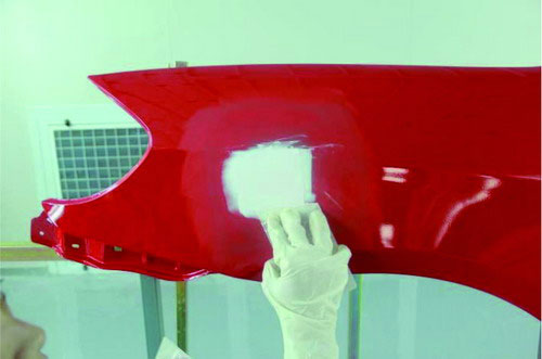 在進(jìn)行原子灰刮涂之前,應(yīng)先對已經(jīng)刷涂好的底漆部分進(jìn)行必要的打磨及清潔。先使用菜瓜布對底漆部分進(jìn)行輕微打磨,可以去掉底漆多余的那部分漆粉。再用吹塵槍進(jìn)行除塵清潔,避免刮涂后的原子灰與底漆結(jié)合不牢固。如圖2-31所示。