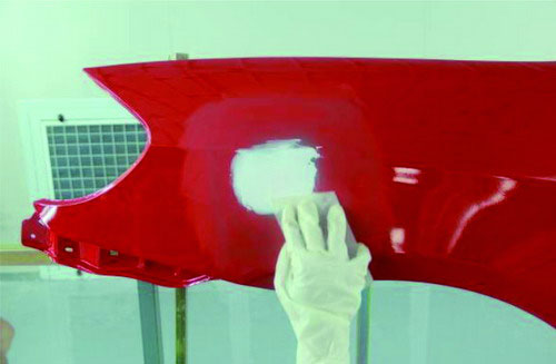 ①砂紙打磨法。在原子灰干燥過程中,可以拿80#的砂紙輕輕地打磨原子灰邊緣薄的部分,檢查原子灰是否已經(jīng)干透。如果沒有干透,則在砂紙上會粘有原子灰;如果已經(jīng)干透,則不會粘上原子灰,并在原子灰上出現(xiàn)堅硬的白色痕跡。如圖2-52所示。
