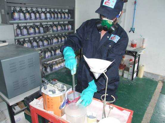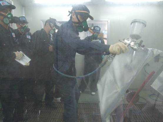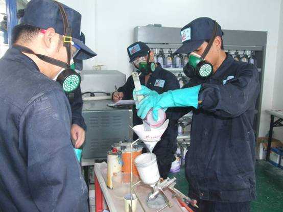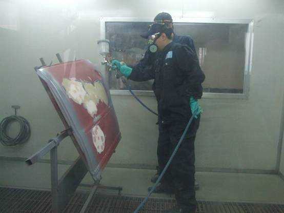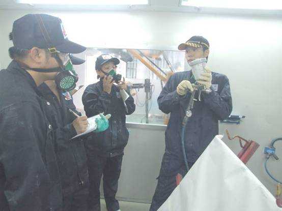 宋老師烤漆房?jī)?nèi)講解調(diào)校噴槍方法