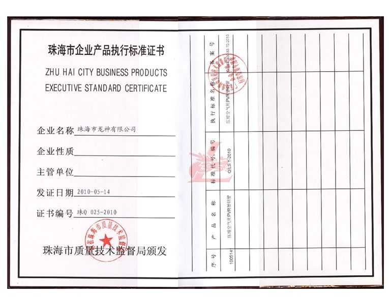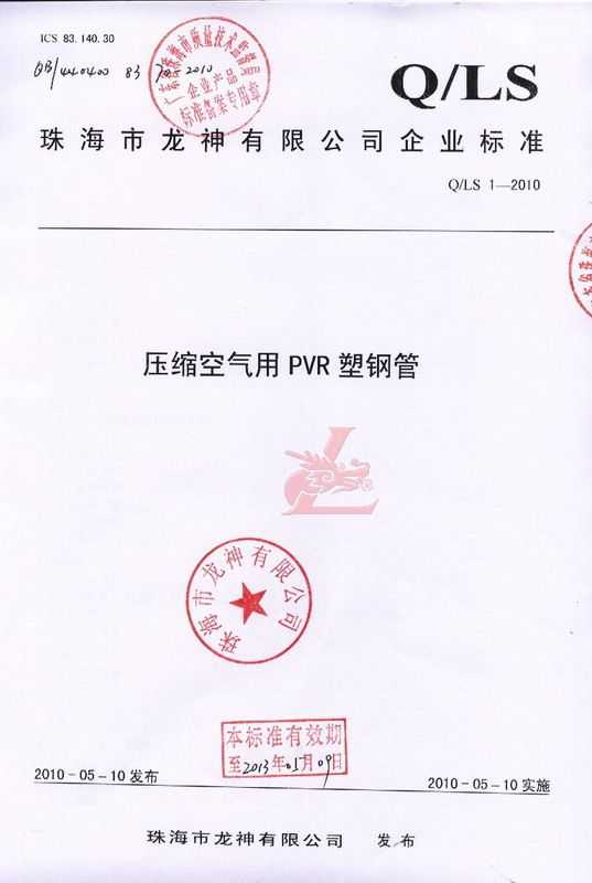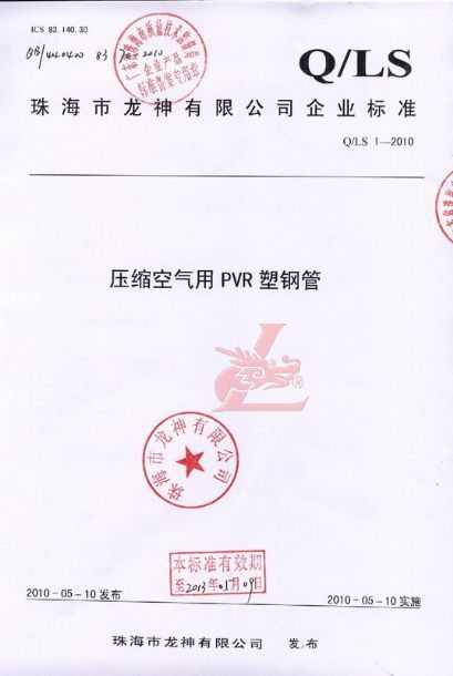 龍神壓縮空氣PVR塑鋼管成功申請(qǐng)企業(yè)執(zhí)行標(biāo)準(zhǔn) 2010年5月珠海市龍神有限公司“壓縮空氣PVR塑鋼管”得到珠海市質(zhì)量技術(shù)監(jiān)督局認(rèn)可,特此頒發(fā)“壓縮空氣PVR塑鋼管企業(yè)執(zhí)行標(biāo)準(zhǔn)”,龍神公司在嚴(yán)格執(zhí)行標(biāo)準(zhǔn)下,保證產(chǎn)品質(zhì)量。 2010-05-20 9954