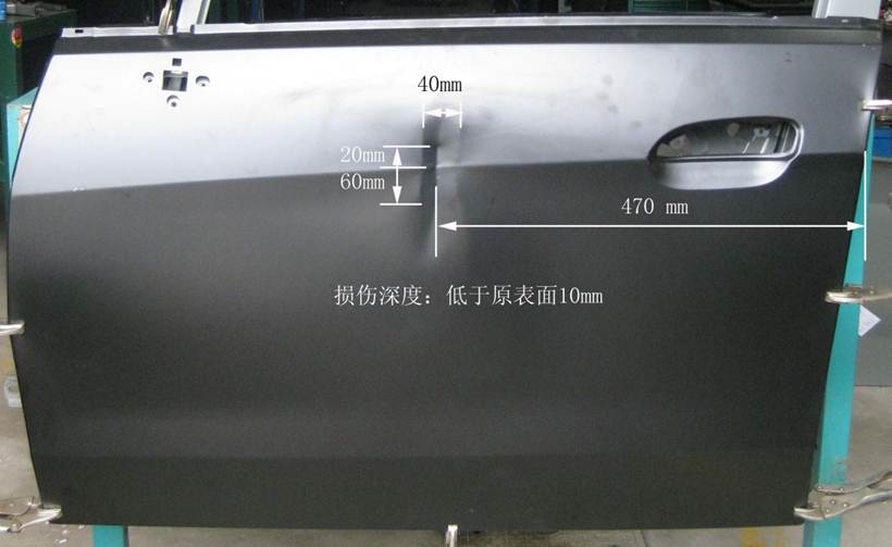 2013年車身修復大賽受損門板修復項目技術方案的補充說明 2013-05-16 19069 2013年車身修復大賽受損門板修復項目技術方案的補充說明 1、受損門板項目的受損位置及尺寸圖片、作業(yè)要求(1)作業(yè)要求在40分鐘內,對雪佛蘭新賽歐左前門外板上的長80mm,寬40mm,深10mm的條形凹陷(漆膜已破壞)進行修復,凹陷損傷穿過車身線。