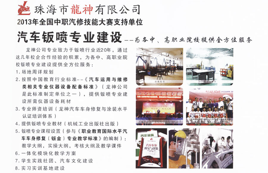 龍神汽車車身修復與涂裝 水平認證培訓體系 2013-06-03 25290 龍神公司專業(yè)致力于鈑噴行業(yè)近20年,通過這幾年校企合作經驗的積累,為各中、高職業(yè)院校鈑噴專業(yè)建設提供全方位服務。