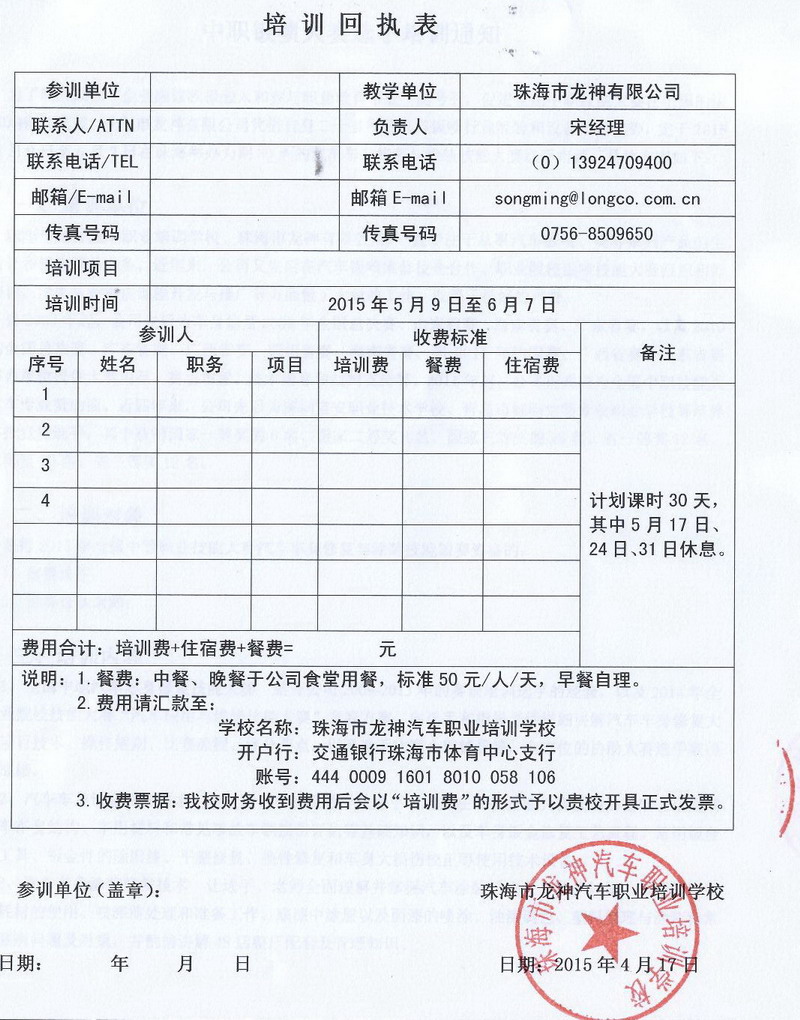 培訓時間30天,即從2015年5月9日起至6月7日止,其中5月17日、24日31日休息;期間餐費按照上課時間27天預收,實際參照離開時間調(diào)整。具體收費情況請來電咨詢。
