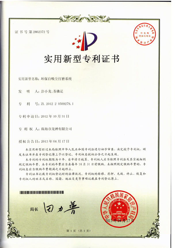 移動(dòng)式無塵干磨專利證書 |