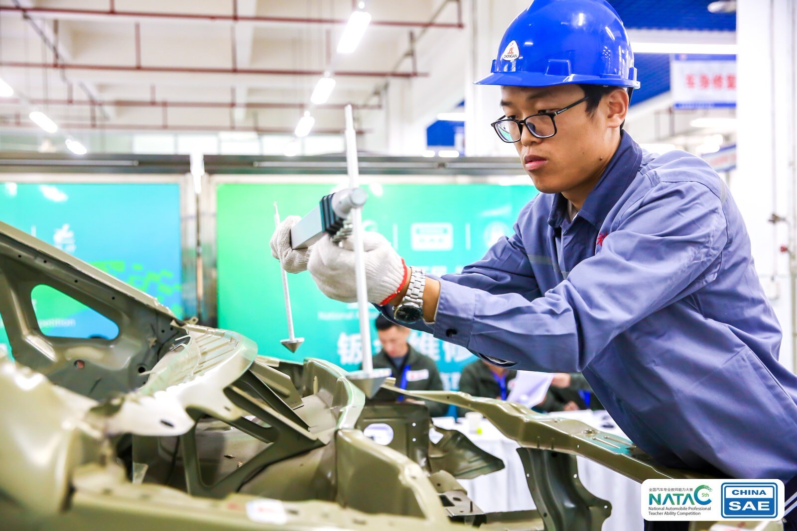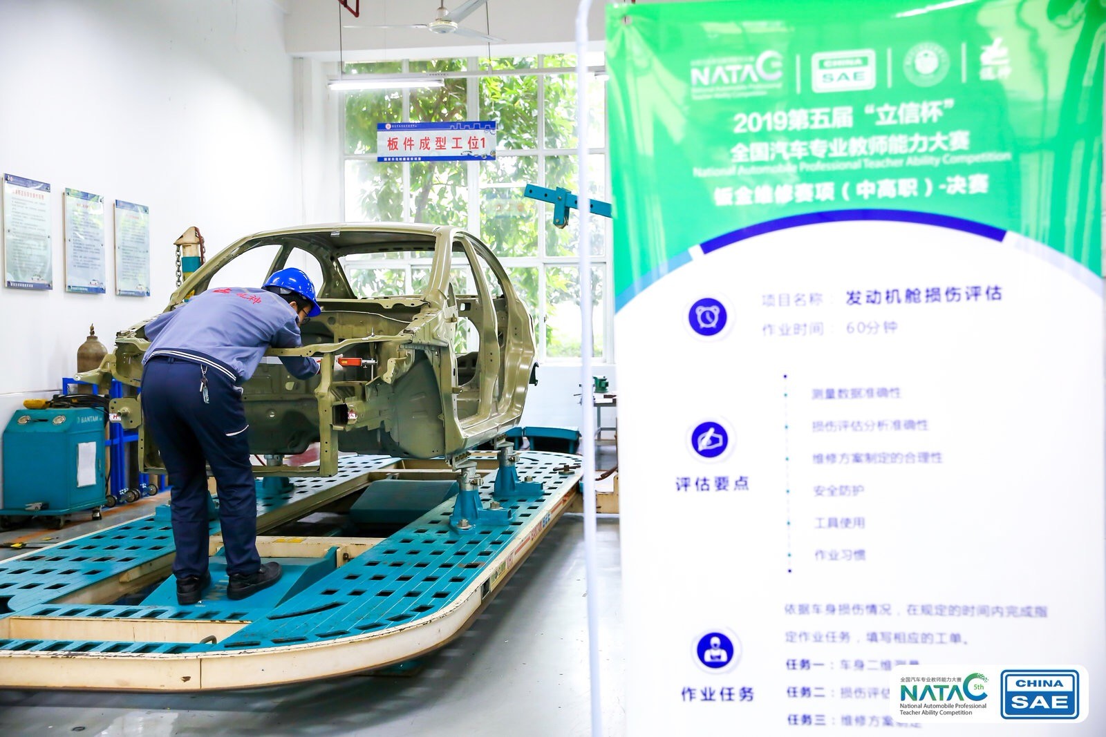 此次鈑金維修賽項分為N進(jìn)36的選拔賽(微課制作)、36進(jìn)4的預(yù)賽(項目是信息化教學(xué)說課、鋼制板件維修、模擬前縱梁更換維修)、決賽(項目是發(fā)動機(jī)艙損傷評估、信息化教學(xué)現(xiàn)場授課)。