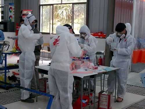 參賽選手統(tǒng)一著裝龍神贊助的噴漆防護進行規(guī)范化的調漆比賽